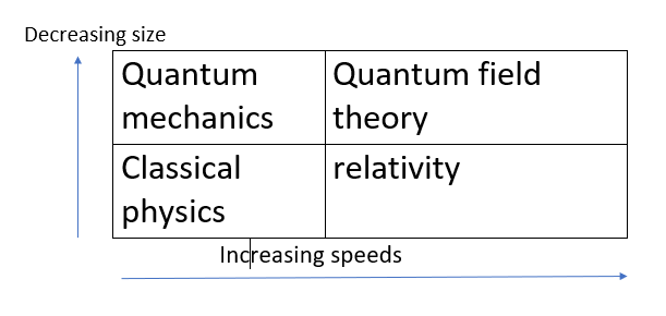 The theoretical physics is again classified in four types on the basis of combination of size and speed of the object being studied, here small size refer to the sizes comparable to the size of atoms and molecules and high speeds refer to the speeds comparable to the speed of light. On this basis theoretical physics can be classified into four parts that are listed and each the part is further more classified on the basis of field it covers viz.